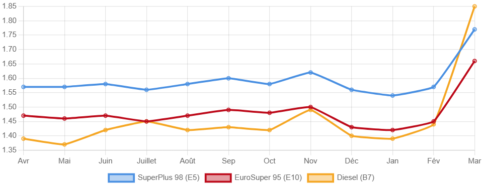 Un surcoût important par rapport au mois dernier, puisque le même plein ne coûtait que 74,25€ le 3 mars. Le carburant reste en tout cas sous son niveau historique, fixé à 2,112€ le 10 mars 2022.